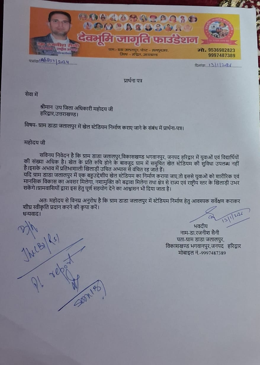 भगवानपुर। आज भगवानपुर में देवभूमि जागृति फाउंडेशन के राष्ट्रीय अध्यक्ष एवं वरिष्ठ समाजसेवी डॉ.रजनीश सैनी ने उप जिला अधिकारी भगवानपुर को प्रार्थना पत्र के माध्यम से अवगत कराते हुए कहा कि ग्राम डाडा जलालपुर में खेल के प्रति रुचि होने के बावजूद भी गांव में समुचित खेल स्टेडियम की सुविधा उपलब्ध नहीं है!खिलाड़ी मैदान में अभ्यास करते समय चोटिल हो जाते हैं।