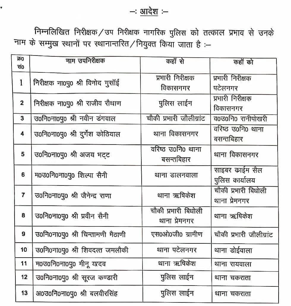 देहरादून जिले के दो थाने के प्रभारियों समेत कुल 14 निरीक्षकों व उपनिरीक्षकों का तबादला, पटेलनगर थाना प्रभारी चंद्रभान सिंह अधिकारी को हरिद्वार जिले में भेजा गया