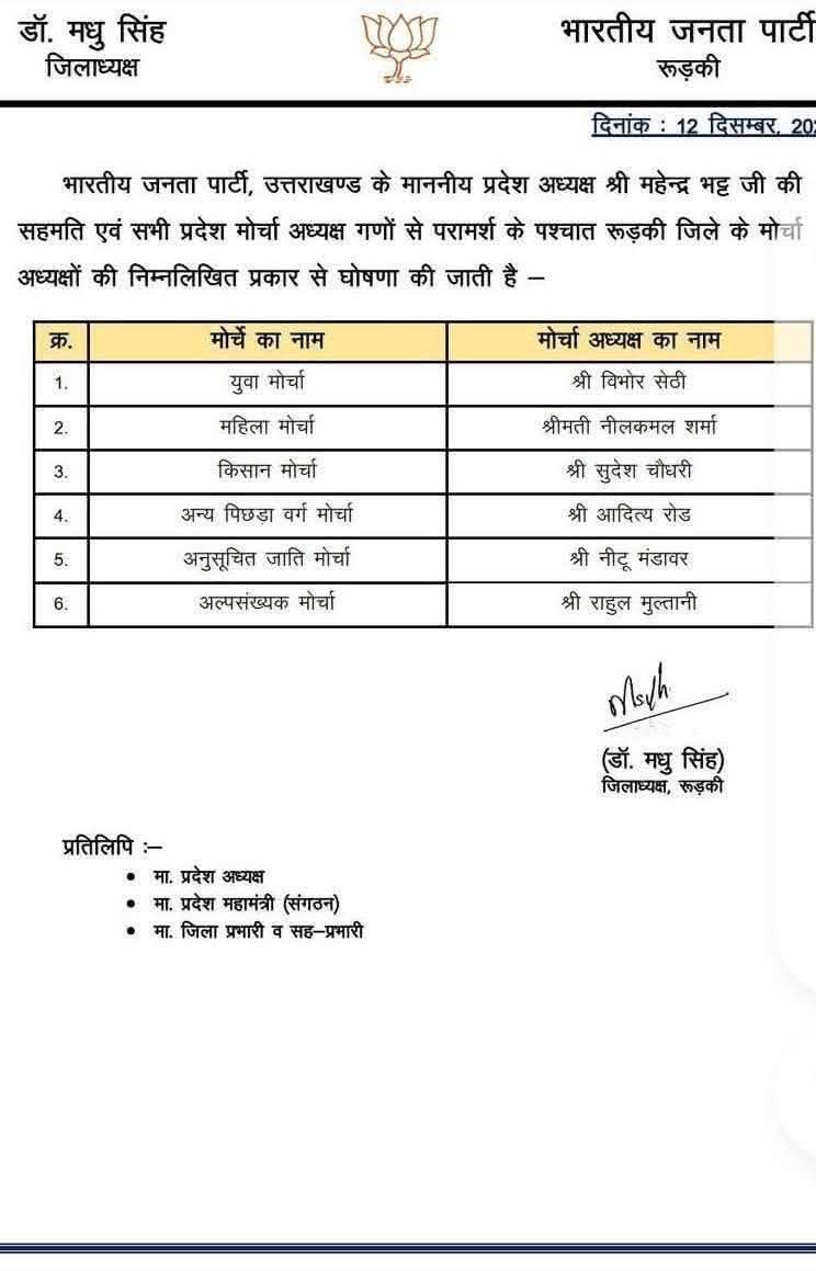 भाजपा रुड़की जिलाध्यक्ष डाॅ मधु सिंह ने मोर्चों के जिलाध्यक्ष के नामों की लिस्ट की जारी, युवा मोर्चा के जिलाध्यक्ष विभोर सेठी और महिला मोर्चा की जिलाध्यक्ष बनी नीलकमल शर्मा