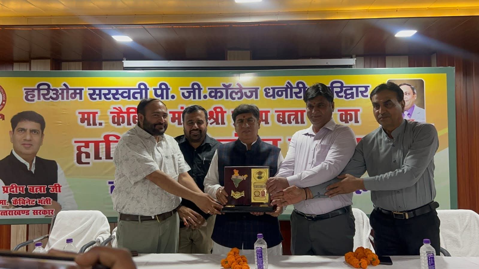 कैबिनेट मंत्री बनने के बाद पहली बार धनौरी पहुंचे रुड़की विधायक प्रदीप बत्रा का हरिओम सरस्वती पीजी कॉलेज धनौरी में भव्य स्वागत किया गया। शिक्षक,शिक्षिकाओं, कर्मचारियों और छात्र-छात्राओं ने पुष्प वर्षा की। कैबिनेट मंत्री प्रदीप बत्रा ने महाविद्यालय के संस्थापक स्वर्गीय डॉ तेजवीर सिंह सैनी की प्रतिमा पर पुष्पांजलि अर्पित की। छात्र-छात्राओं को संबोधित करते हुए प्रदीप बत्रा ने कहा कि ग्रामीण क्षेत्र के युवाओं को आधुनिक शिक्षा से जोड़ने में इस संस्था का बड़ा योगदान है।