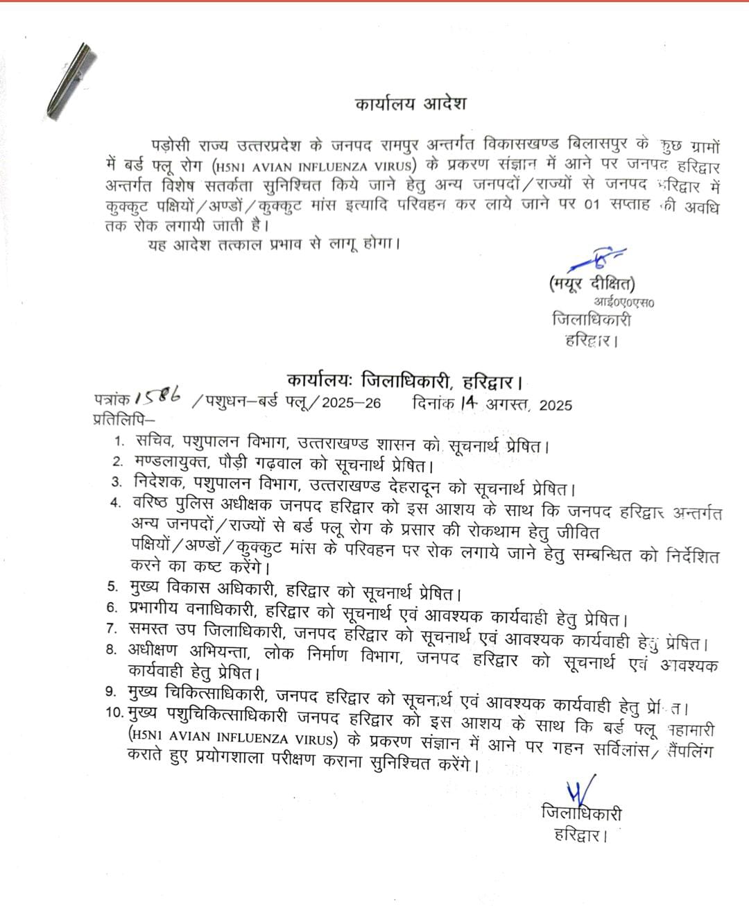 जिला मजिस्ट्रेट एवं डीएम मयूर दीक्षित ने अन्य जनपदों / राज्यों से जनपद हरिद्वार में कुक्कुट पक्षियों/अण्डों / कुक्कुट मांस इत्यादि परिवहन कर लाए जाने पर 01 सप्ताह की अवधि तक लगाई रोक