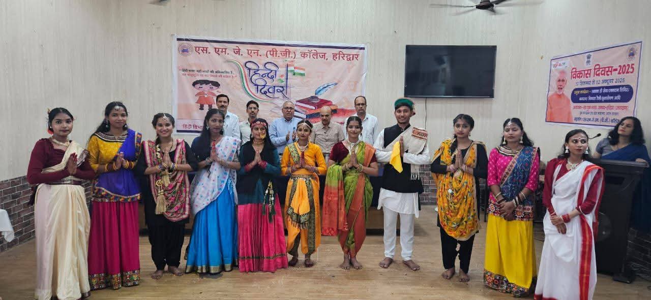 हरिद्वार । आज एस एम जे एन (पीजी )कॉलेज हरिद्वार में हिंदी विभाग तथा आंतरिक गुणवत्ता आश्वासन प्रकोष्ठ द्वारा हिंदी उत्सव कार्यक्रम का आयोजन किया गया। कार्यक्रम की शुरुआत मां सरस्वती वंदना से की गई । कार्यक्रम की रूपरेखा समझते हुए हिंदी विभाग की प्राध्यापिका डॉ लता शर्मा ने हिंदी भाषा के उद्भव और विकास पर प्रकाश डाला । बी एस सी की छात्रा सोनाली ने माँ दुर्गा सप्तशती से मां दुर्गा की स्तुति की जबकि बी एस सी के छात्र दिव्यांशु नेगी ने नशे के दुष्प्रभाव पर हिंदी भाषा में कविता का पाठ किया। बी एस सी की छात्रा ईशा कश्यप एवं बी कॉम के छात्र अंश कुमार ने हिंदी के महत्व को दिखाते हुए कविता प्रस्तुत की। इसी क्रम में दीक्षा यादव ने सोहनलाल द्विवेदी की कविता” पर्वत कहता शीश उठाकर “की सुंदर प्रस्तुति दी ।