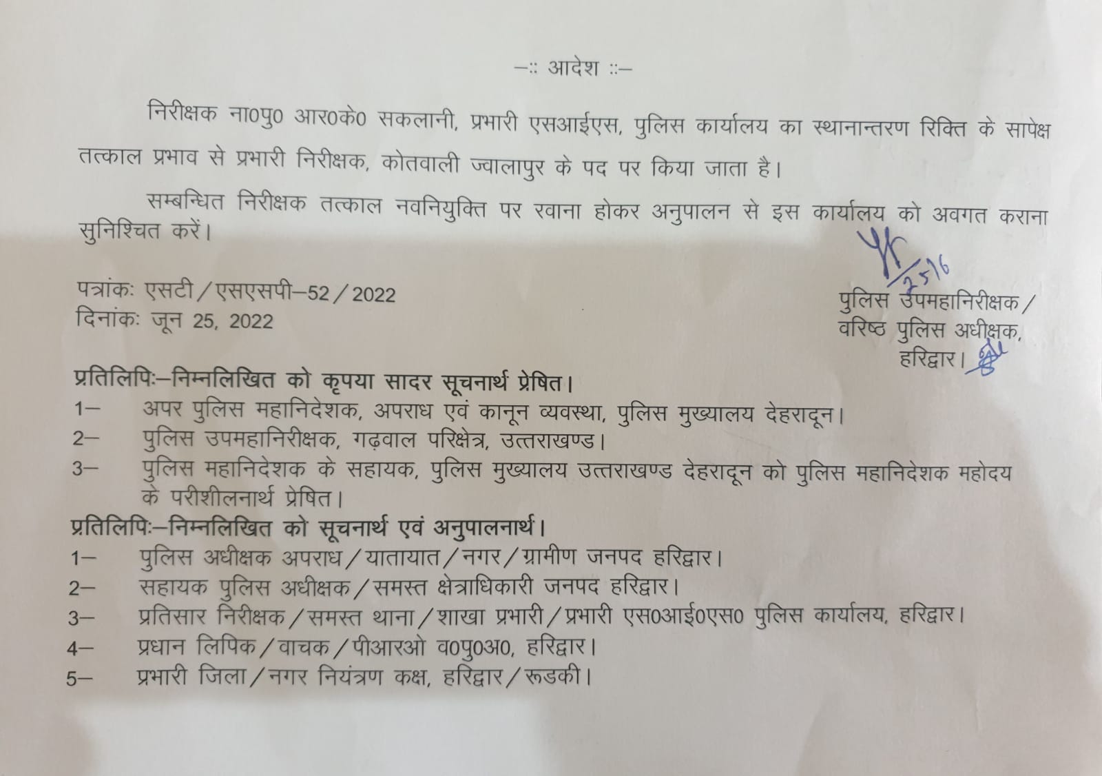 इंस्पेक्टर राम किशोर सकलानी बने ज्वालापुर कोतवाली के नए प्रभारी, एसएसपी ने जारी किए आदेश