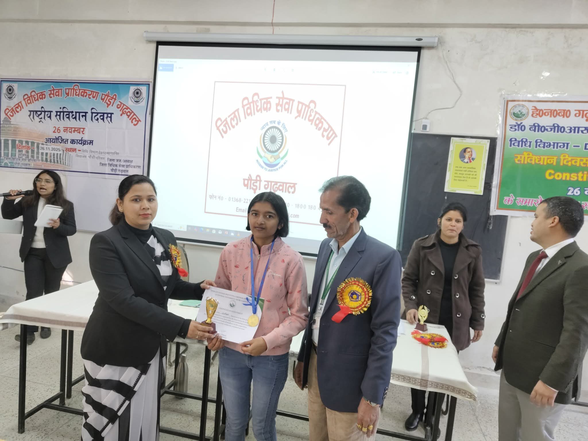 पौड़ी । जिला विधिक सेवा प्राधिकरण के तत्वावधान में हेमवती नंदन बहुगुणा गढ़वाल विश्वविद्यालय परिसर में संविधान दिवस के अवसर पर विधिक जागरुकता एवं साक्षरता शिविर आयोजित किया गया। शिविर में छात्र–छात्राओं को नालसा विषय ‘एक मुट्ठी आसमान’ के अंतर्गत लोकपाल, नशा विरोधी चलचित्र, डाउन अभियान ‘तुम गिरना मत’ तथा नशा मुक्त भारत हेतु जागरुकता और स्वास्थ्य मार्गदर्शन विषय पर आधारित लघु चलचित्र दिखाया गया।