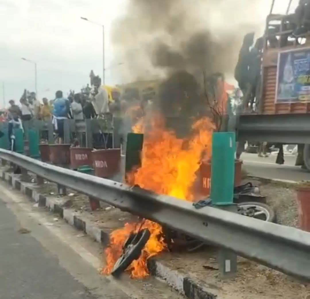 हरिद्वार गुरुकुल कांगड़ी फ्लाईओवर पर अचानक आग का गोला बनी मोटरसाइकिल, मची अफरा तफरी