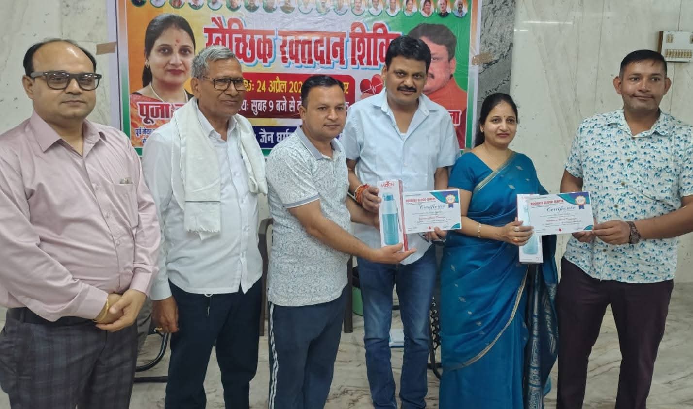 वरिष्ठ समाज सेविका पूजा गुप्ता तथा कांग्रेस के प्रदेश महामंत्री सचिन गुप्ता ने कहा कि रक्तदान करने वाले व्यक्ति में बहुत जल्दी नए खून की पूर्ति हो जाती है और शरीर भी स्वस्थ रहता है।उन्होंने लोगों से समय-समय पर रक्तदान करने तथा स्वास्थ्य के प्रति जागरूक रहने का आह्वान किया।इस अवसर पर डॉ विनय गुप्ता,डॉक्टर संजय गर्ग,डॉक्टर अर्पित सैनी,डॉक्टर नायर,मनोज गोयल, हेमेंद्र चौधरी,दीपक अरोड़ा,वैभव गुप्ता,यश गोयल,सुनील गुप्ता,सौरभ गोयल,सुनील सिंघल,अजय सिंघल,सुभाष सिंघल,आर्यन गुप्ता,अमित अग्रवाल,विपिन गुप्ता,विजय गुप्ता,अरविंद गुप्ता,उमंग गुप्ता,शुभम गुप्ता,गौरव,अंकित प्रधान,रविंद्र चौधरी,पंकज सोनकर,सुमित सोनकर,अखिल अग्रवाल,हिमांशु गुप्ता,सुनील कश्यप,शकील अहमद,राजकुमार,सलमान आदि प्रमुख रूप से मौजूद रहे।