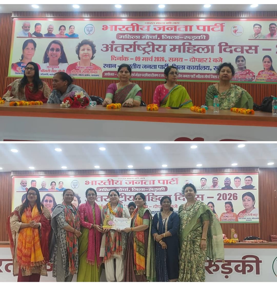 रुड़की। भाजपा महिला मोर्चा की ओर से दिल्ली रोड स्थित भाजपा कार्यालय में अंतरराष्ट्रीय महिला दिवस के अवसर पर कार्यक्रम आयोजित किया गया। मुख्य वक्ता के रूप में भाजपा प्रदेश महामंत्री नेहा जोशी ने कहा कि केंद्र और राज्य सरकार महिलाओं के सम्मान, सुरक्षा और सशक्तिकरण के लिए लगातार कार्य कर रही हैं। सरकार की विभिन्न योजनाओं से महिलाओं को शिक्षा, रोजगार और स्वरोजगार के बेहतर अवसर मिल रहे हैं। भाजपा जिलाध्यक्ष डॉ. मधु सिंह ने कहा कि आज महिलाएं हर क्षेत्र में आगे बढ़ रही हैं और देश के विकास में महत्वपूर्ण भूमिका निभा रही हैं। वहीं महिला मोर्चा जिलाध्यक्ष नीलकमल शर्मा ने कहा कि महिला दिवस महिलाओं के सम्मान और अधिकारों के प्रति समाज को जागरूक करने का अवसर है। कार्यक्रम का आयोजन महिला मोर्चा जिलाध्यक्ष नीलकमल शर्मा के संयोजन में किया गया। इस अवसर पर पूर्व महिला आयोग सदस्य एवं वरिष्ठ भाजपा नेत्री रश्मि चौधरी, राखी चंद्रा, सावित्री मंगला, देवकी जोशी, रिशु वर्मा, निधि शांडिल्य, प्रतिभा चौहान, दीप्ति रावत, गीता मलिक, आशा धस्माना, नीलम, ममता चहल, गीता रावत, अनीता गुप्ता, सुनीता गोस्वामी और मिथलेश राठी सहित अनेक कार्यकर्ता मौजूद रही।