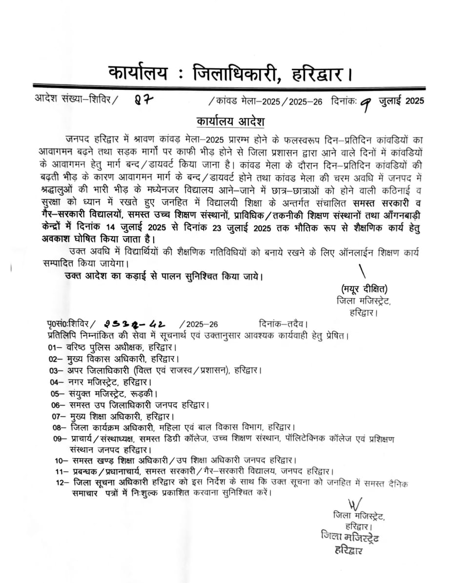 कांवड मेला के दौरान दिन-प्रतिदिन कांवडियों की बढ़ती भीड़ के कारण आवागमन मार्ग के बन्द/ डायवर्ट होने तथा कांवड मेला की चरम अवधि में जनपद में श्रद्धालुओं की भारी भीड़ के मध्येनजर विद्यालय आने-जाने में छात्र-छात्राओं को होने वाली कठिनाई व सुरक्षा को ध्यान में रखते हुए जनहित में विद्यालयी शिक्षा के अन्तर्गत संचालित समस्त सरकारी व गैर-सरकारी विद्यालयों, समस्त उच्च शिक्षण संस्थानों, प्राविधिक / तकनीकी शिक्षण संस्थानों तथा आँगनबाड़ी केन्द्रों में दिनांक 14 जुलाई 2025 से दिनांक 23 जुलाई 2025 तक भौतिक रूप से शैक्षणिक कार्य हेतु अवकाश घोषित किया गया है।