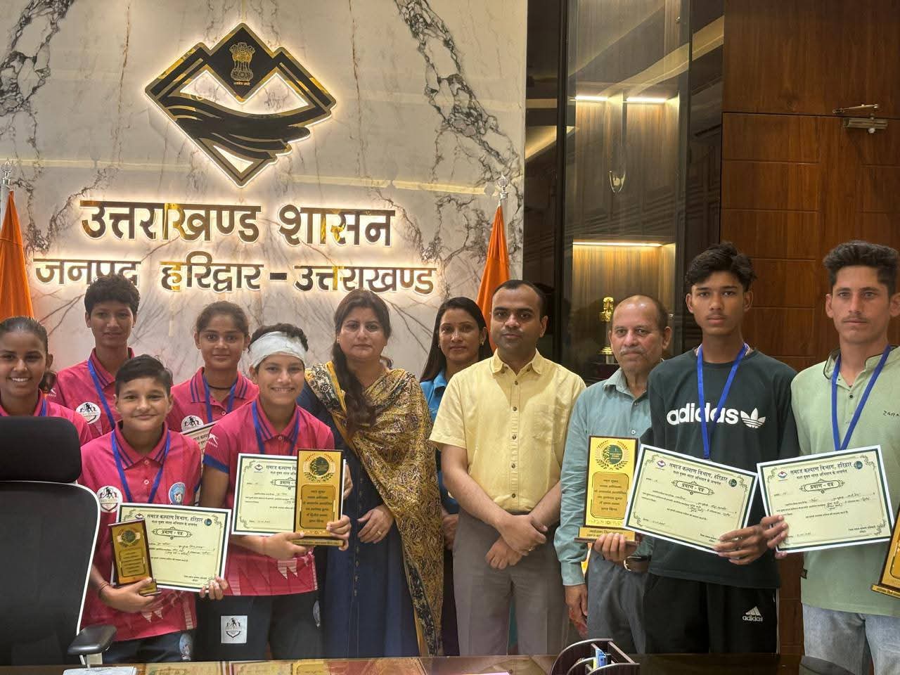 हरिद्वार । जिला प्रशासन एवं समाज कल्याण विभाग के तत्वाधान में नशा मुक्त भारत अभियान के सफल क्रियान्विन हेतु 12 जून को रन अगेंस्ट ड्रग्स दौड का आयोजन विकास भवन रोशनाबाद हरिद्वार से स्पोर्टस स्टेडियम रोशनाबाद हरिद्वार तक किया गया। इस दौड़ में अंडर 14 बालक एवं बालिका वर्ग तथा ओपन आयु वर्ग के अन्तर्गत समस्त आयु वर्ग के प्रतिभागियों द्वारा प्रतिभाग किया गया। उक्त दौड़ में हर वर्ग से प्रथम तीन पायदान प्राप्त करने वाले प्रतिभागियों को आज जिला कार्यालय में जिलाधिकारी मयूर दीक्षित द्वारा प्रथम, द्वितीय एवं तृतीय स्थान प्राप्त करने वाले छात्र छात्राओंc को मेडल, ट्राफी एवं प्रमाण पत्र प्रदान देकर सम्मानित किया गया।
