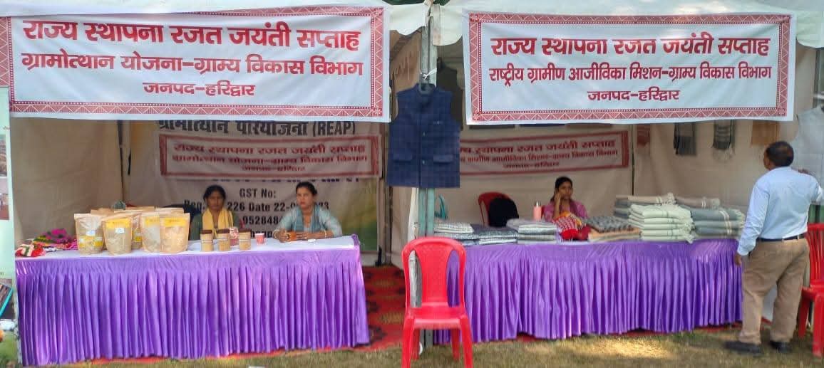 हरिद्वार । उत्तराखंड राज्य स्थापना के २५ गौरवशाली वर्ष पूर्ण होने के उपलक्ष में मुख्यमंत्री पुष्कर धामी के निर्देशन में रजत जयंती सप्ताह कार्यक्रम आयोजित किए जा रहे हैं जनपद के मुख्य कार्यक्रम ऋषिकुल राजकीय आयुर्वेदिक महाविद्यालय परिसर एवं आडिटोरियम में कार्यक्रम आयोजित किए जा रहे हैं। इस अवसर पर ग्राम्य विकास विभाग, हरिद्वार द्वारा लगाए गए स्टॉल के माध्यम से स्वयं सहायता समूहों (Self Help Groups – SHGs) के उत्पादों की बिक्री की गई। इस स्टॉल को लोगों का भरपूर समर्थन मिला और ग्रामीण महिलाओं द्वारा तैयार किए गए उत्पादों ने खूब सराहना बटोरी।