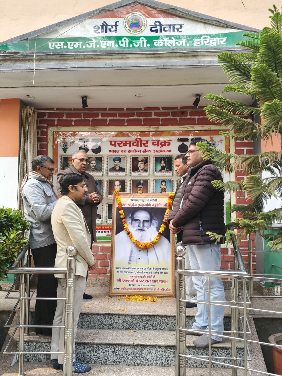 हरिद्वार । आज एस. एम. जे. एन. पी. जी. कॉलेज में महानायक इंद्रमणि बडोनी के 100वीं जयन्ती पर कॉलेज परिवार द्वारा कार्यक्रम का आयोजन किया गया। इस अवसर पर महाविद्यालय के प्राचार्य प्रो सुनील कुमार बत्रा सहित प्राध्यापकों, शिक्षणेत्तर कर्मचारियों तथा अनेको छात्र छात्राओं ने उत्तराखंड के गाँधी जननायक इंद्रमणि बडोनी की प्रतिमा पर माल्यार्पण तथा पुष्प अर्पित कर उन्हें नमन किया। इस अवसर पर प्रो सुनील कुमार बत्रा ने बडोनी के संघर्षों और योगदान पर चर्चा करते हुए कहा कि महानायक इंद्रमणि बडोनी का संघर्ष ही उत्तराखण्ड राज्य निर्माण में नींव का पत्थर बना हैं।