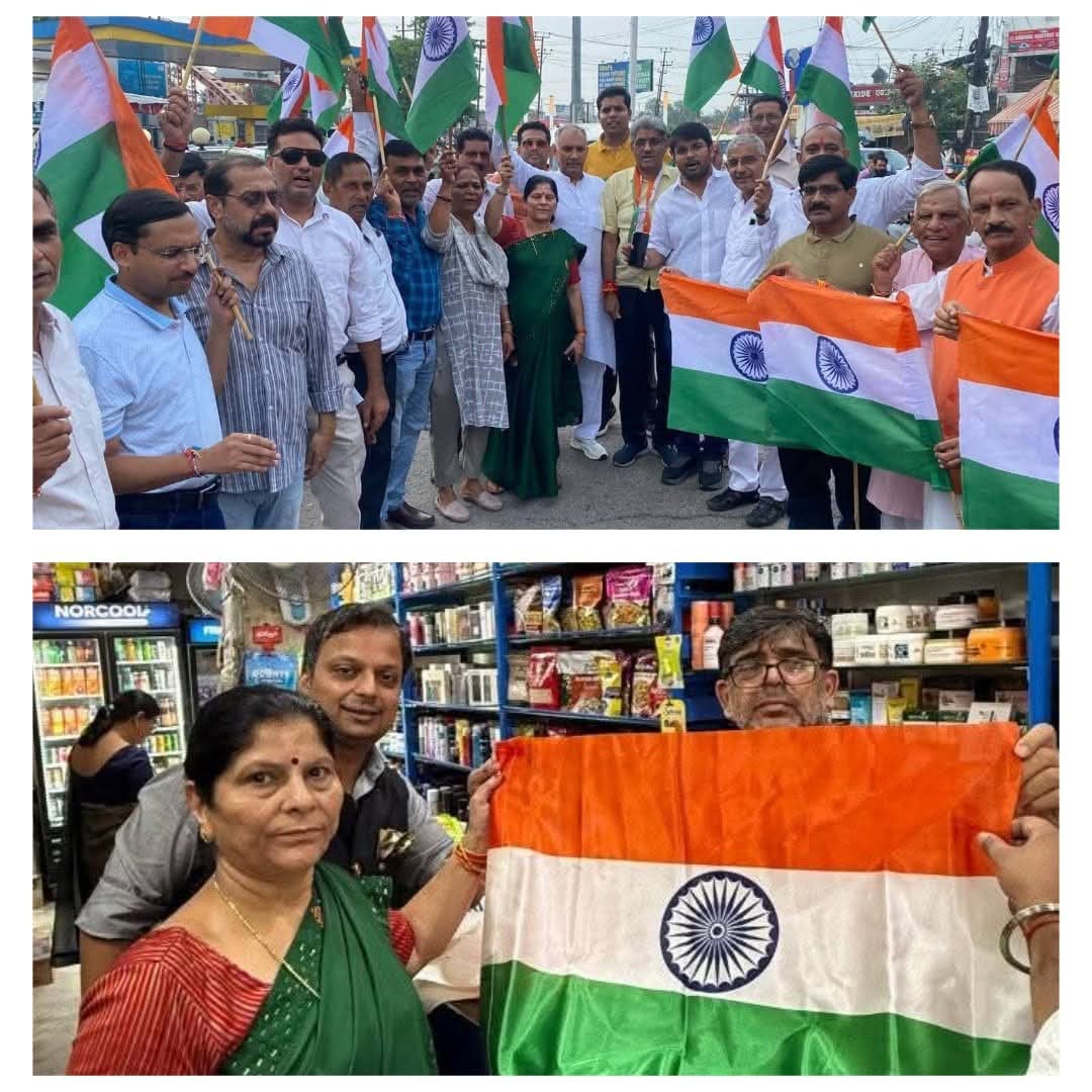 रुड़की । भारतीय जनता पार्टी हर घर तिरंगा अभियान के तहत रुड़की विधानसभा के सिविल लाइंस मंडल में मंडल स्तर पर हर घर तिरंगा घर-घर तिरंगा यात्रा का आयोजन किया गया। कार्यक्रम के जिला सहसंयोजक भाजपा युवा नेता अक्षय प्रताप के नेतृत्व में निकाली गई है तिरंगा यात्रा में सभी व्यापारियों को भाजपा कार्यकर्ताओं व पदाधिकारियों ने उनके प्रतिष्ठानों पर जाकर उन्हें राष्ट्रीय ध्वज तिरंगा वितरित किया साथ ही उन्हें राष्ट्र प्रेम की भावनाओं से भी प्रेरित किया।