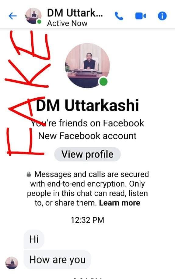 उत्तरकाशी। जिलाधिकारी प्रशांत आर्य के नाम और फोटो का दुरुपयोग कर एक फर्जी फेसबुक अकाउंट बनाए जाने का गंभीर मामला सामने आया है। अज्ञात साइबर अपराधियों और असामाजिक तत्वों द्वारा बनाई गई इस आईडी से आम नागरिकों को फ्रेंड रिक्वेस्ट भेजकर और संदेशों के माध्यम से अवैध रूप से धन की मांग की जा रही है, जो एक गंभीर साइबर अपराध है।